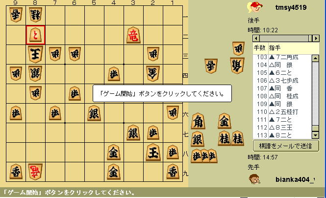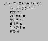 | 1月6日 降臨 Ro引退後、Y将棋に乗り込むことにした。 以前のbiancaという古いタイプのを捨てcをkに変えて新たにレートを作った。 久しぶりの将棋でいきなり2連杯(レート1100台 その後レート狩りを開始 ![]() 調子が少し戻る。 1300代はいけるね♪ |