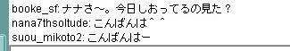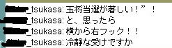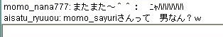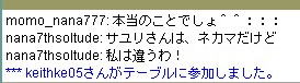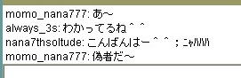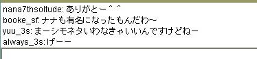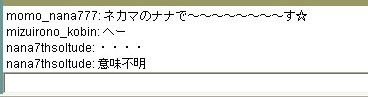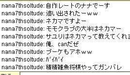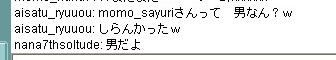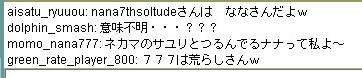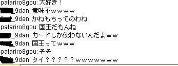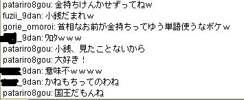 | 8月 29日 Y将ラウンジ戦@ 最近会を立ち上げました。 今から約2ヶ月前、ユキさん率いる白棋の会は巨暴桃クラブのブーケ(通称:モモ会)によって解散させられた。 ユキさんは「会は潰したくないけど、これ以上やつらには耐えられない」と、言葉を残して・・・ そこで、師匠(兵庫県代表)と会を立ち上げ 少しずつ基盤をつくり、メッセで会話可能な白棋の会のメンバー3人を仲間に入れ 計5人で再出発を果たした。(ジュミナさんが入ってくれるそうな・・) 昨日、会のメンバーが師匠と自分の2人しかいなかったので この、暴君を皆に知らせるために立ち上がった。 モモ会の悪大将 ネカマのナナ ネカマのサユリ そこで暇つぶしに初級7に乗り込んだ。 適当にメインでナナはネカマだよなーと宣伝してたら ヤジを飛ばすやつらがでてきた。 どうやら共産主義者が初級7には多いそうだ ![]() おかまいなし。 ヤジ軍団に挑発を試みる ![]() patariro8gou がひときわ目立つ、ウザイ ![]() 国王というので真っ先に思い浮かんだのは「タイ」 自分のちっぽけな頭をフル回転させてもタイぐらいしかの国しか思いつかん! ここで叩かれたら終わりだと覚悟した。 しかし、patariro8gou は何の返答も無しに姿を消した。 そこで、師匠 IDをぱくってみる ナナ派の一人が反応する。 どうやらナナ本人だと思い込んでいるようだ。 オマエがアホだ。 |